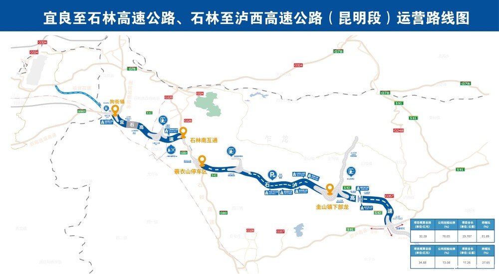 石林至泸西高速公路(昆明段)项目批复概算总投资34.88亿元,起于石林至锁龙寺高速公路蓑衣山停车区,在石锁高速设蓑衣山互通与国高网G80广昆高速公路石锁段相连,沿线设长湖落地互通、圭山落地互通,止于石林县圭山镇下部龙。项目于2020年6月10日建成通车,石林至泸西高速公路(昆明段)全长27.26公里(其中红河州弥勒市境内2.07公里、石林县境内25.19公里),双向四车道,设有乍龙停车区。项目建设为完善云南省高速公路路网布局、改善滇中经济圈交通需求提供重要支撑。