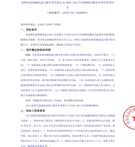 昆明东南绕城高速公路开发有限公司2020-2023年法律顾问服务竞争性谈判公告