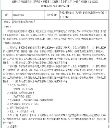 石林至泸西高速公路(昆明段)建设项目运营期日常养护工程(小修)项目施工招标公告