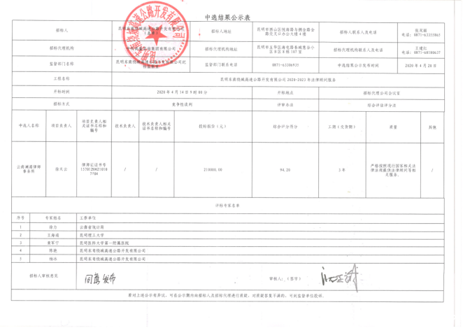 昆明东南绕城高速公路开发有限公司2020-2023年法律顾问服务中选结果公示