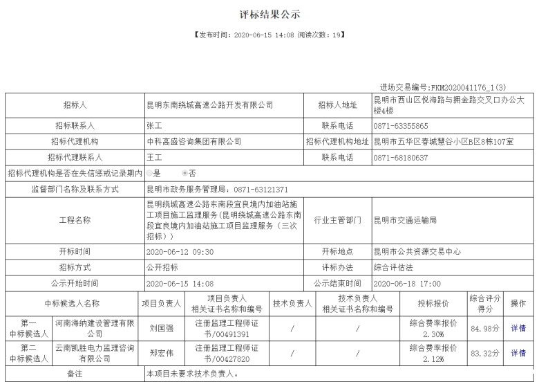 昆明绕城高速公路东南段宜良境内加油站施工项目监理服务(三次)评标结果公示