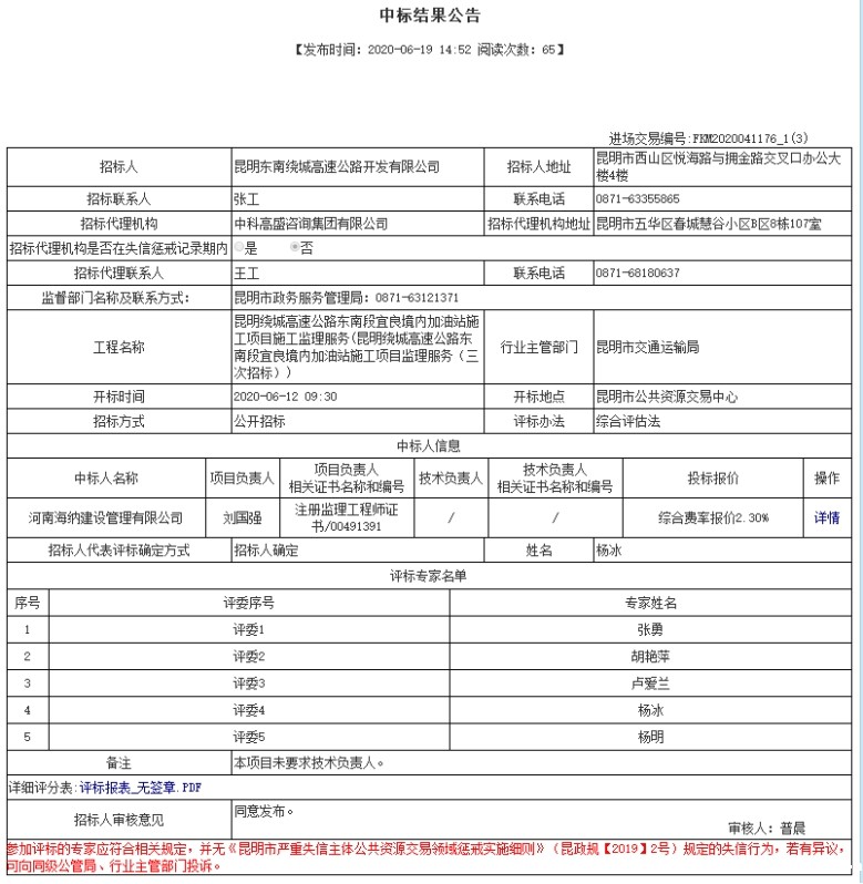 昆明绕城高速公路东南段宜良境内加油站施工项目监理服务(三次)中标结果公告
