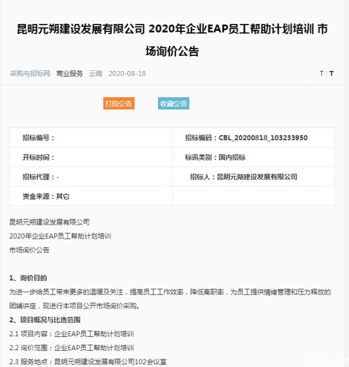 昆明元朔建设发展有限公司2020年企业EAP员工帮助计划培训市场询价公告