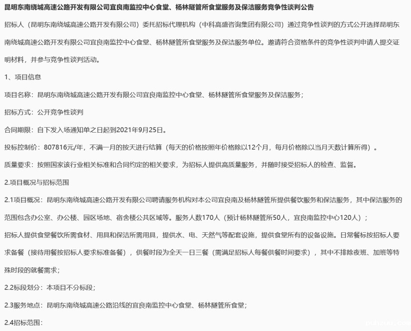 昆明东南绕城高速公路开发有限公司宜良南监控中心食堂、杨林隧管所食堂服务及保洁服务竞争性谈判公告