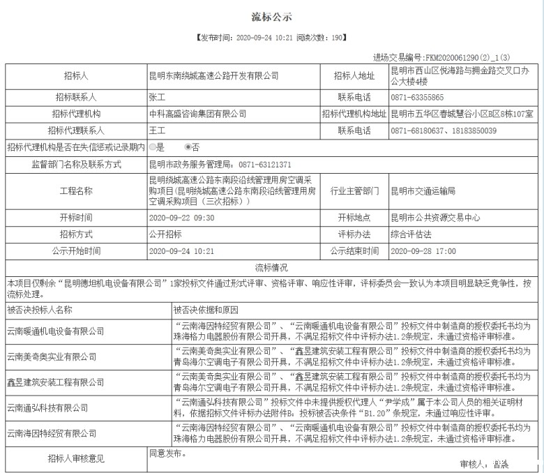 昆明绕城高速公路东南段沿线管理用房空调采购项目(三次)流标公示