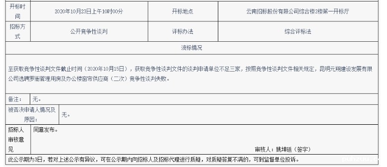 昆明元朔建设发展有限公司选聘罗衙管理用房及办公楼窗帘供应商(二次)流标公示