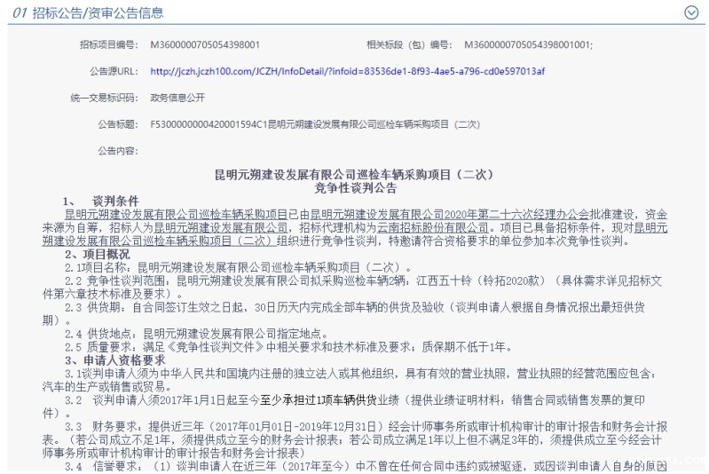 昆明元朔建设发展有限公司巡检车辆采购项目(二次)竞争性谈判公告