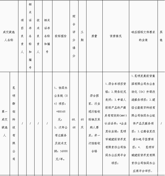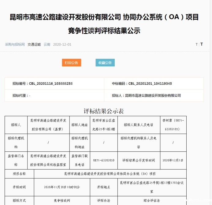 昆明市高速公路建设开发股份有限公司协同办公系统(OA)项目竞争性谈判评标结果公示