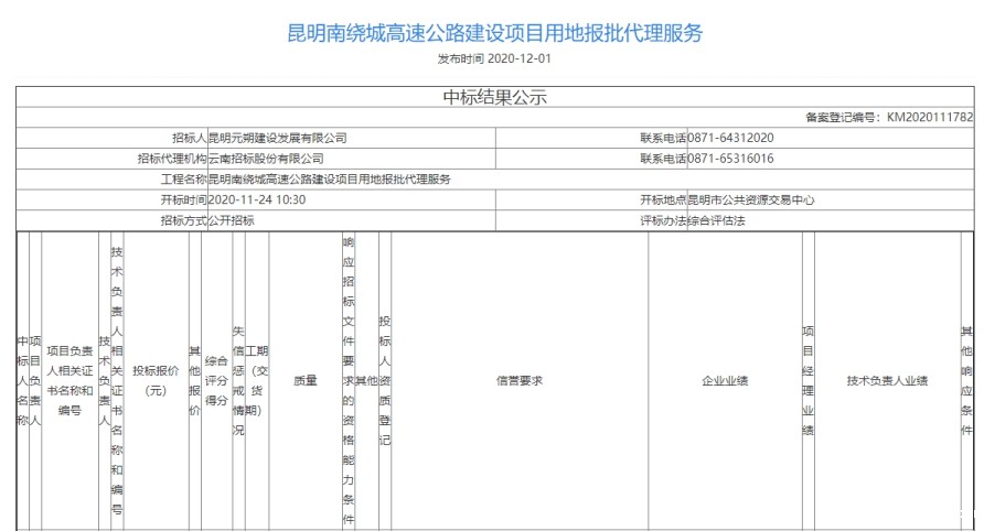 昆明南绕城高速公路建设项目用地报批代理服务中标结果公示