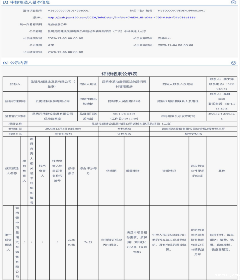 昆明元朔建设发展有限公司巡检车辆采购项目评标结果公示