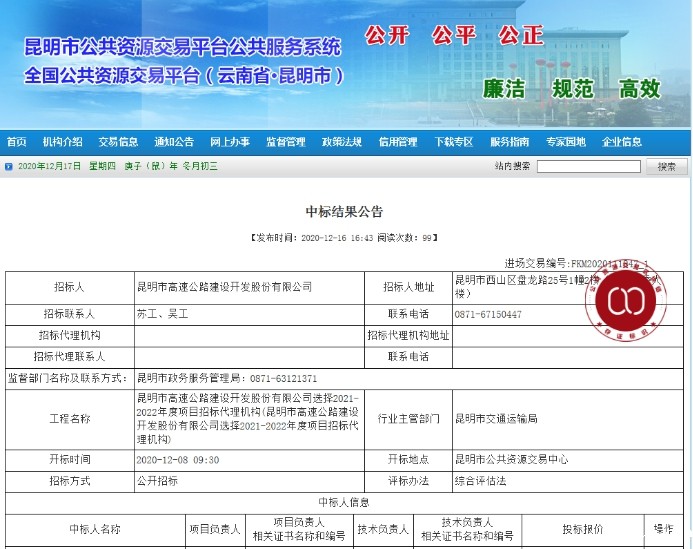 昆明市高速公路建设开发股份有限公司选择2021-2022年度项目招标代理机构中标结果公示