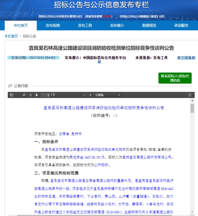 宜良至石林高速公路建设项目消防验收检测单位竞争性谈判公告(二次)