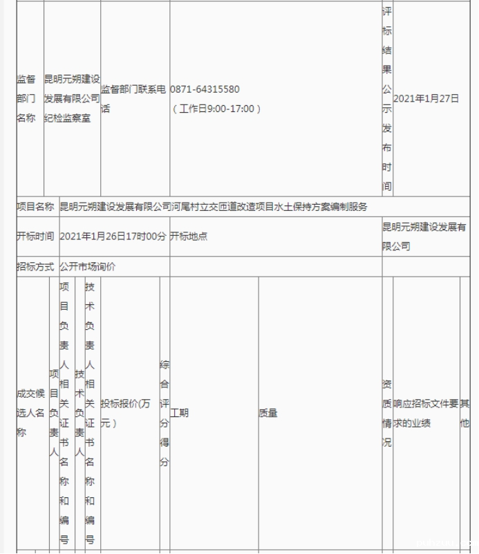 昆明元朔建设发展有限公司河尾村立交匝道改造项目水土保持方案编制服务评标结果公示