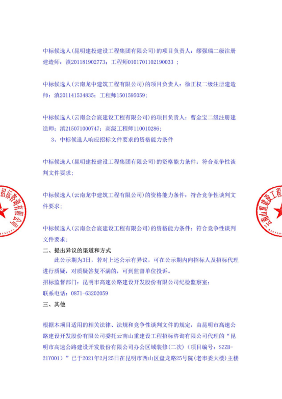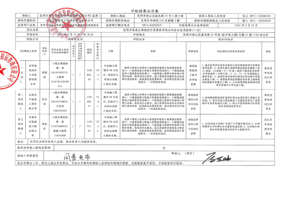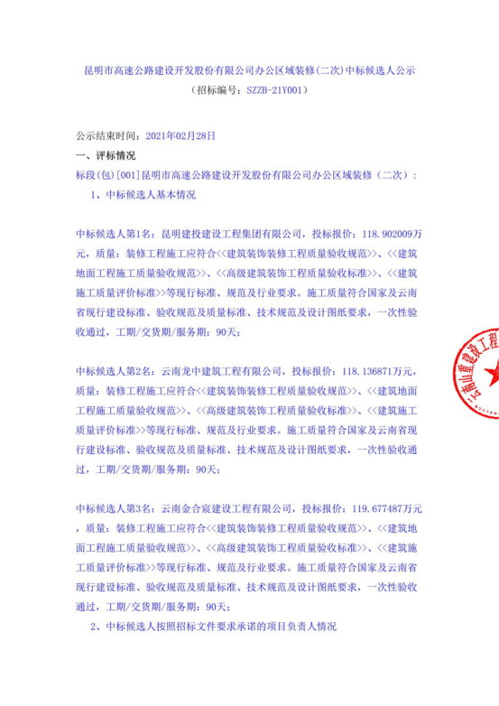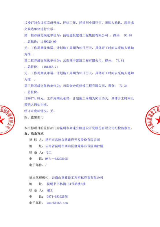 昆明市高速公路建设开发股份有限公司办公区域装修(二次) 评标结果公示