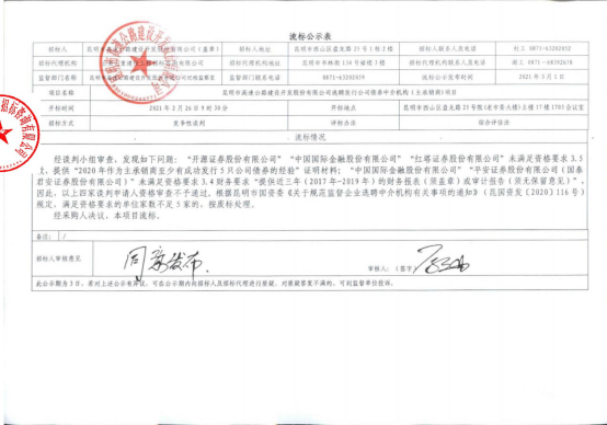 昆明市高速公路建设开发股份有限公司选聘发行公司债券中介机构(主承销商)项目流标公示