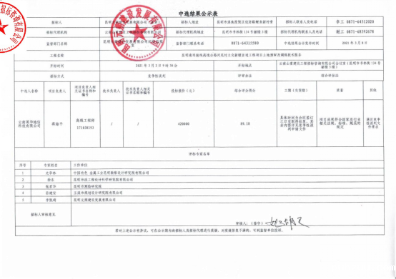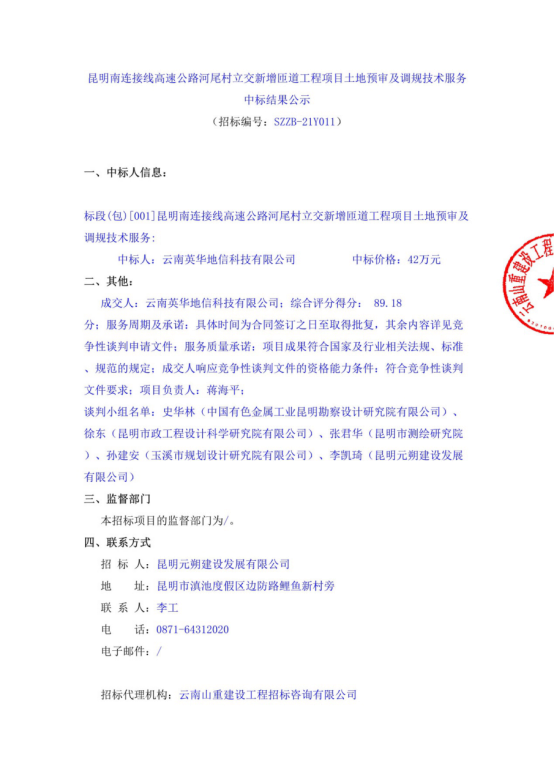 昆明南连接线高速公路河尾村立交新增匝道工程项目土地预审及调规技术服务中标结果公示