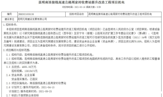 昆明南连接线高速公路周家村收费站提升改造工程项目机电招标公告