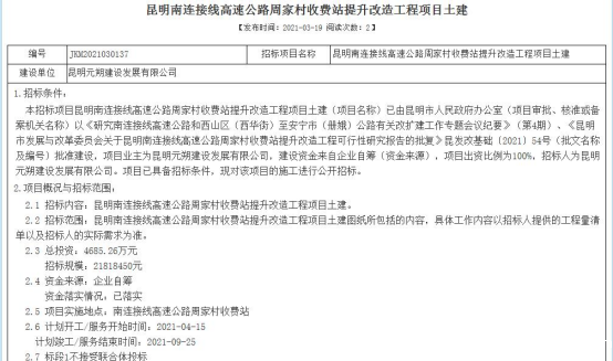 昆明南连接线高速公路周家村收费站提升改造工程项目土建招标公告