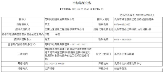 昆明南连接线高速公路周家村收费站提升改造工程项目监理招标中标结果公示