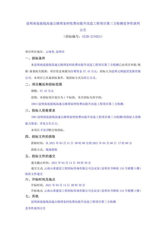 昆明南连接线高速公路周家村收费站提升改造工程项目第三方检测竞争性谈判公告