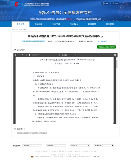昆明高速公路资源开发投资有限公司办公区域询价活动评审结果公示