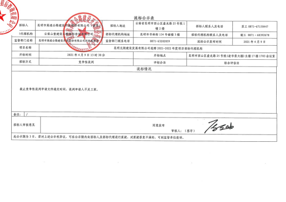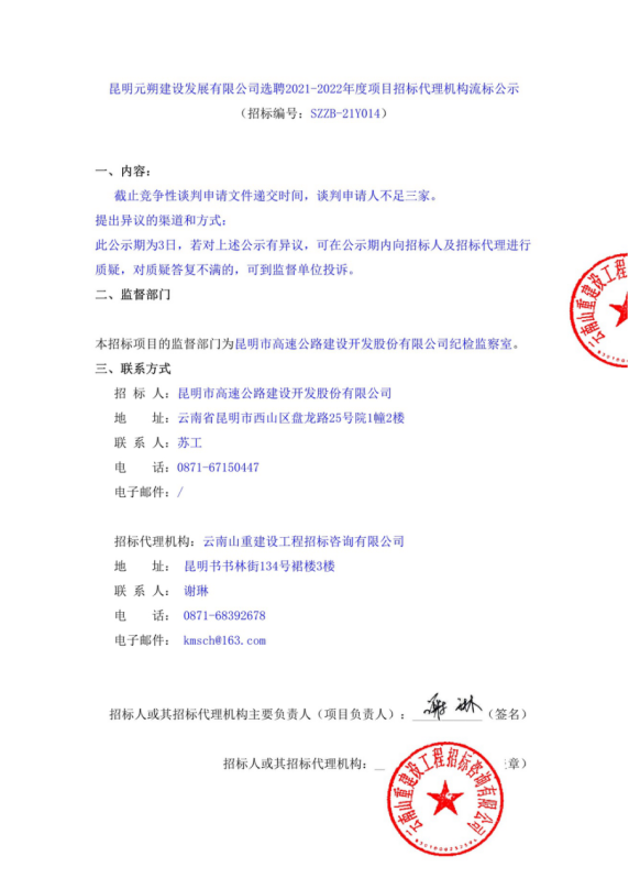 昆明元朔建设发展有限公司选聘2021-2022年度项目招标代理机构流标公示