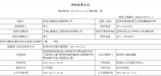 昆明南连接线高速公路周家村收费站提升改造工程项目土建评标结果公示