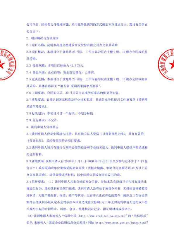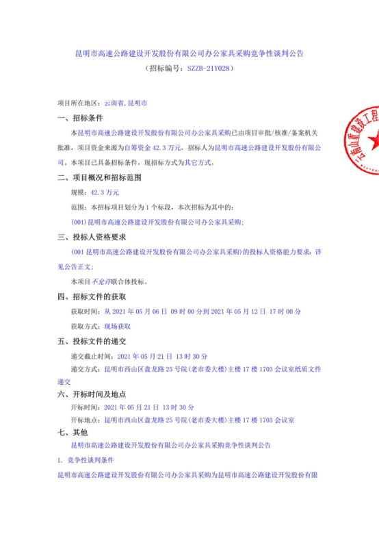 昆明市高速公路建设开发股份有限公司办公家具采购竞争性谈判公告