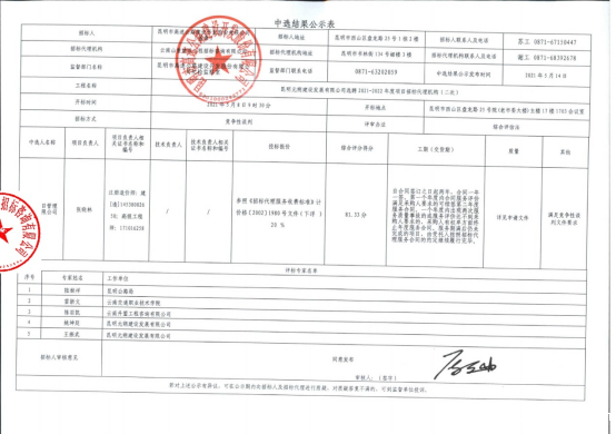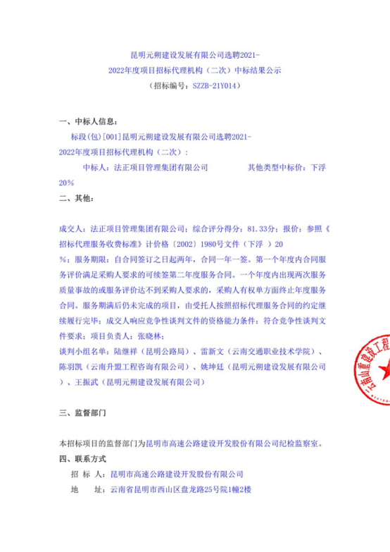 昆明元朔建设发展有限公司选聘2021-2022年度项目招标代理机构(二次)中标结果公示