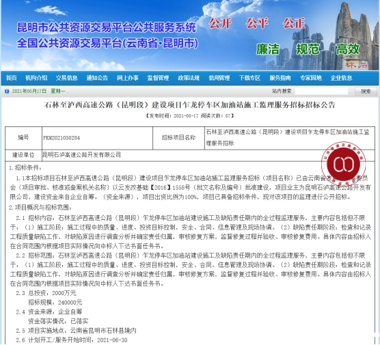 石林至泸西高速公路(昆明段)建设项目乍龙停车区加油站施工监理服务招标招标公告