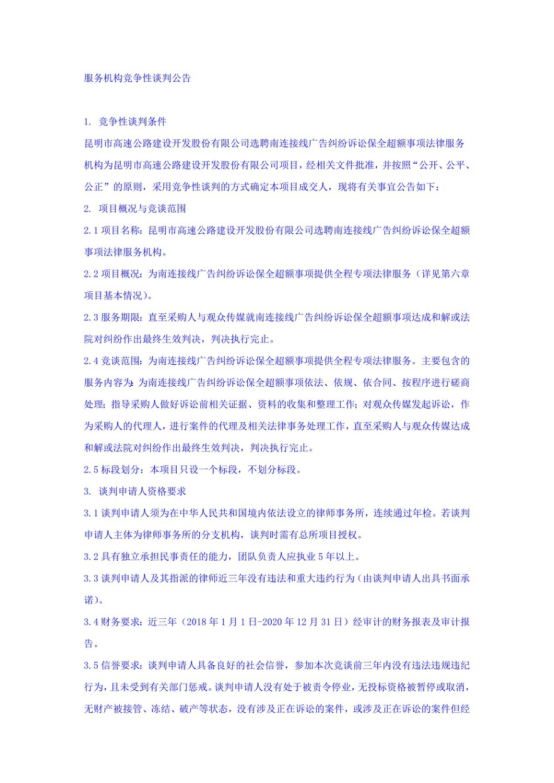 昆明市高速公路建设开发股份有限公司选聘南连接线广告纠纷诉讼保全超额事项法律服务机构竞争性谈判公告