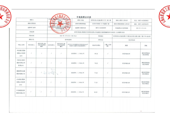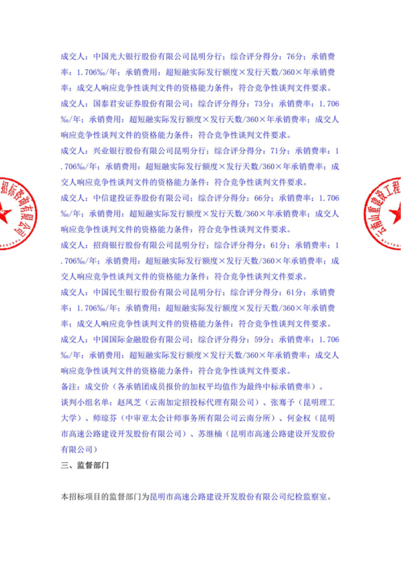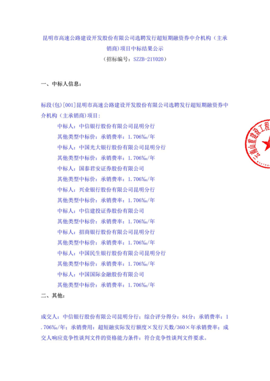 昆明市高速公路建设开发股份有限公司选聘发行超短期融资券中介机构(主承销商)项目中标结果公示