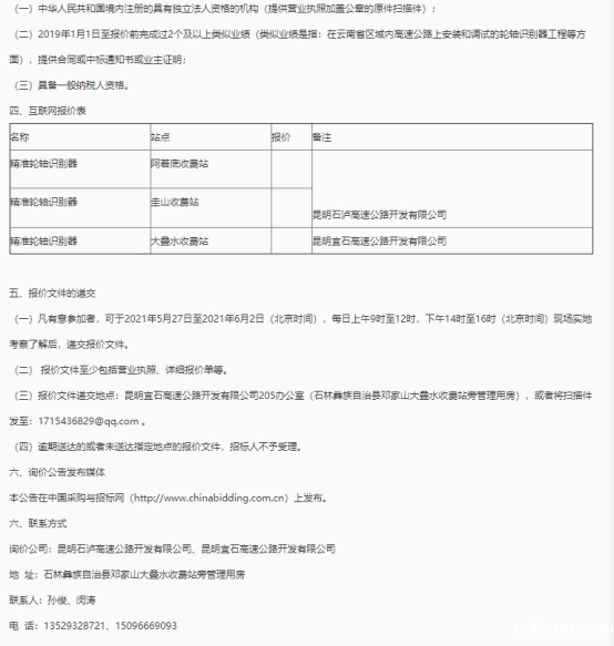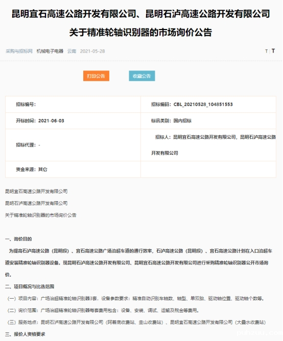 昆明宜石高速公路开发有限公司、昆明石泸高速公路开发有限公司关于精准轮轴识别器的市场询价公告