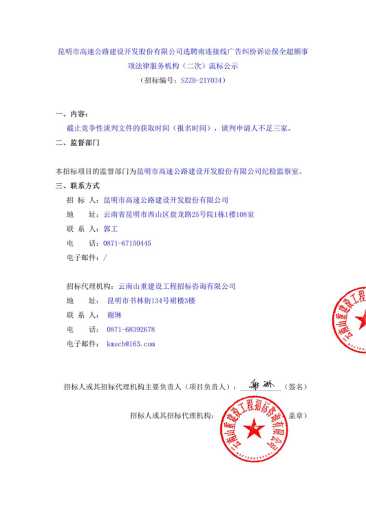 昆明市高速公路建设开发股份有限公司选聘南连接线广告纠纷诉讼保全超额事项法律服务机构(二次)流标公示