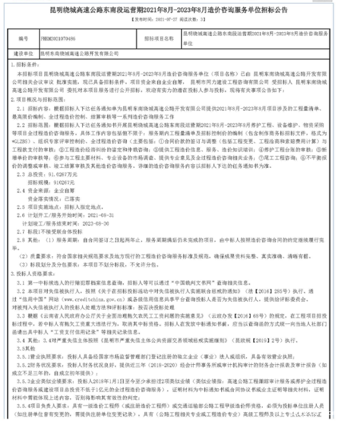 昆明绕城高速公路东南段运营期2021年8月-2023年8月造价咨询服务单位招标公告