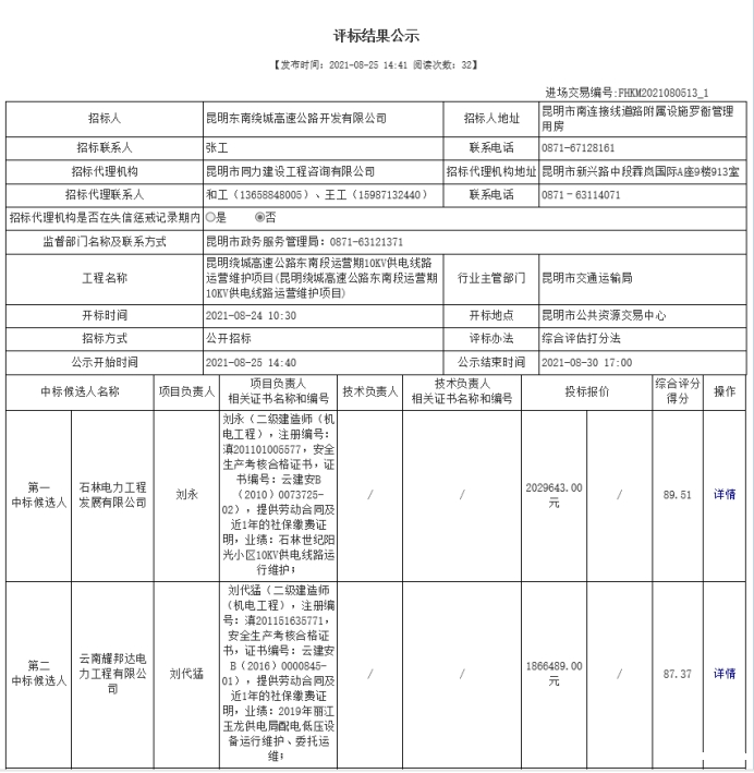 昆明绕城高速公路东南段运营期10KV供电线路运营维护项目评标结果公示