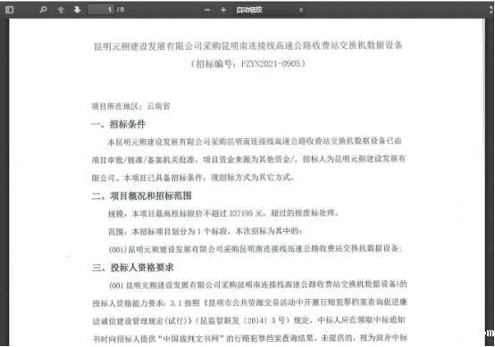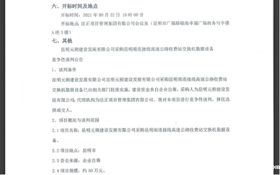 昆明元朔建设发展有限公司采购昆明南连接线高速公路收费站交换机数据设备