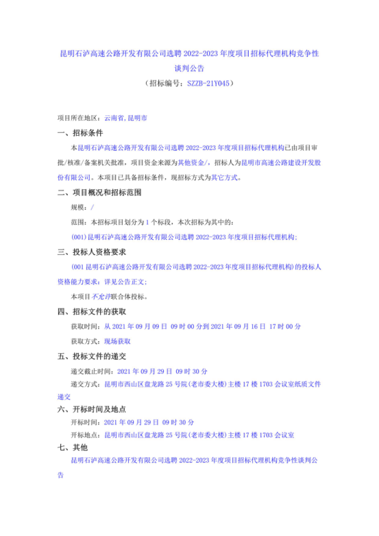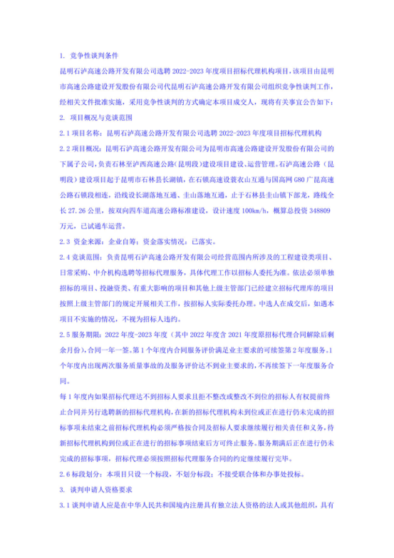 昆明石泸高速公路开发有限公司选聘2022-2023年度项目招标代理机构