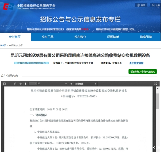 昆明元朔建设发展有限公司采购昆明南连接线高速公路收费站交换机数据设备评标结果公示