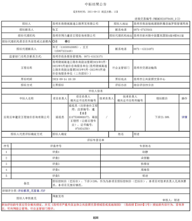 昆明绕城高速公路东南段运营期2021年8月-2023年8月造价咨询服务单位(二次)中标结果公告