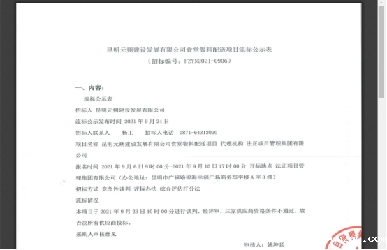 昆明元朔建设发展有限公司食堂餐料配送项目流标公示