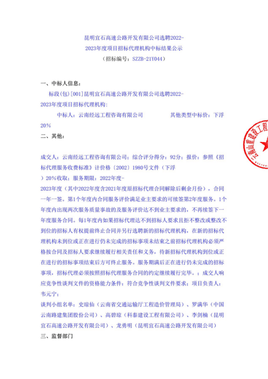 昆明宜石高速公路开发有限公司选聘2022-2023年度项目招标代理机构中标结果公示