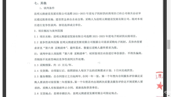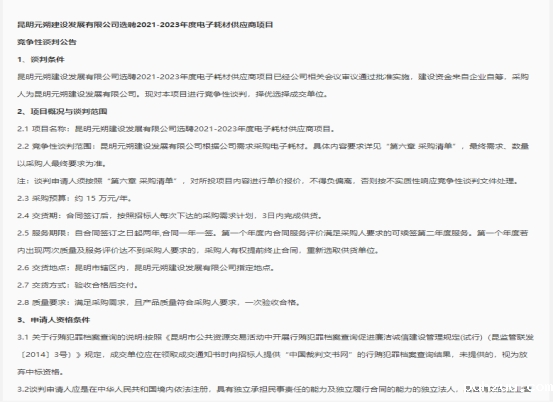 昆明元朔建设发展有限公司选聘2021-2023年度电子耗材供应商项目竞争性谈判公告