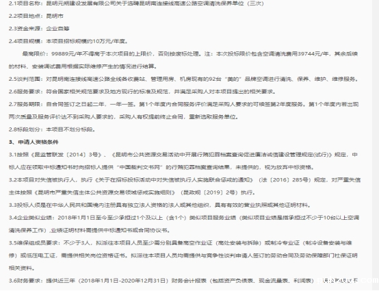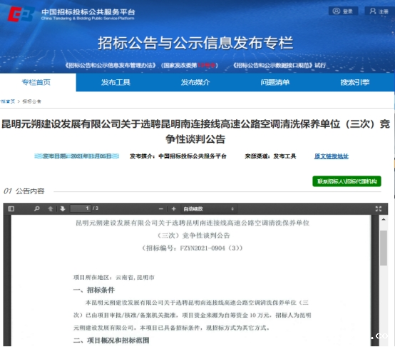 昆明元朔建设发展有限公司选聘昆明南连接线高速公路空调清洗保养单位(三次)竞争性谈判公告