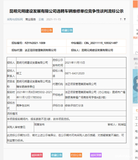 昆明元朔建设发展有限公司选聘车辆维修单位竞争性谈判流标公示