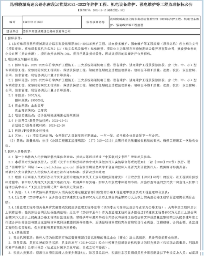 昆明绕城高速公路东南段运营期2021-2023年养护工程、机电设备维护、强电维护等工程监理招标公告