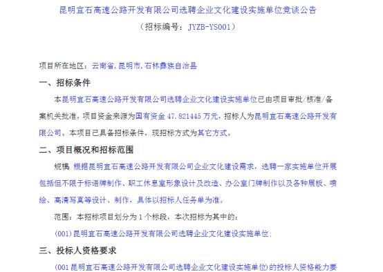 关于昆明宜石高速公路开发有限公司选聘企业文化建设实施单位竞争性谈判公告