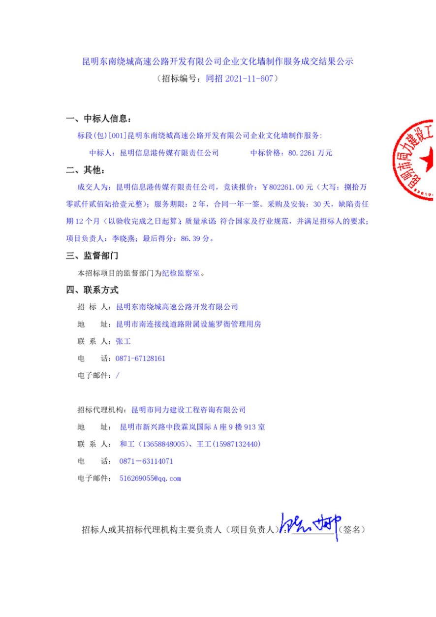 昆明东南绕城高速公路开发有限公司企业文化墙制作服务成交结果公示