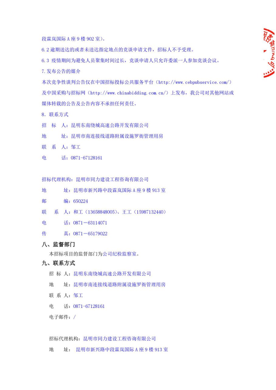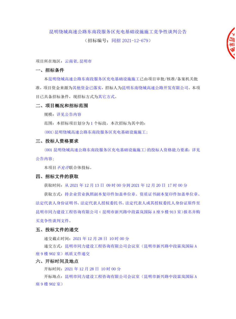 昆明绕城高速公路东南段服务区充电基础设施施工竞争性谈判公告