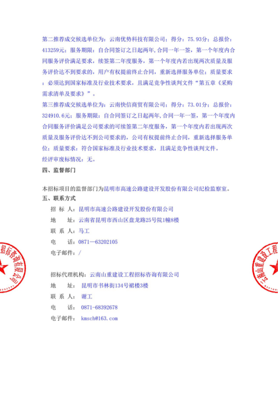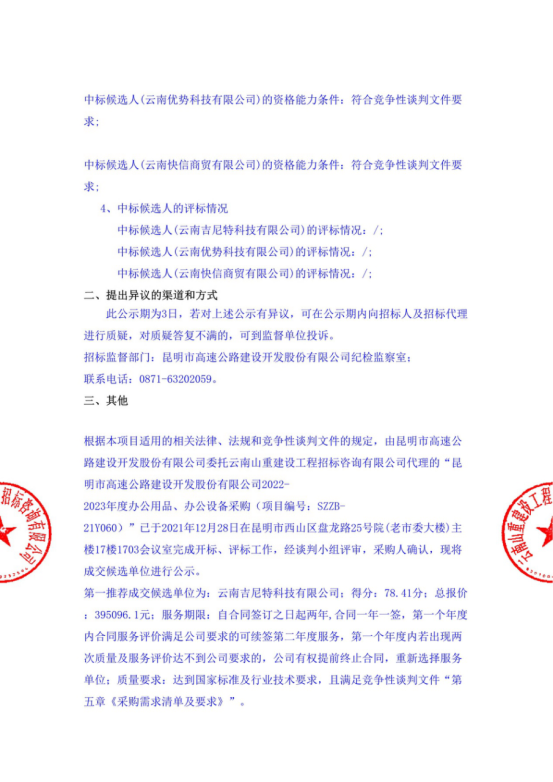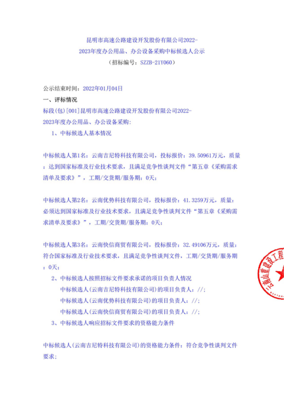 昆明市高速公路建设开发股份有限公司2022-2023年度办公用品、办公设备采购中标候选人公示